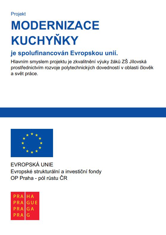 ZŠ Jílovská 1100/16 PROJEKT: ZŠ Jílovská - Modernizace kuchyňky reg.č.CZ.07.4.67/0.0/17_054/0001002 Projekt je spolufinancován Evropskou unií.